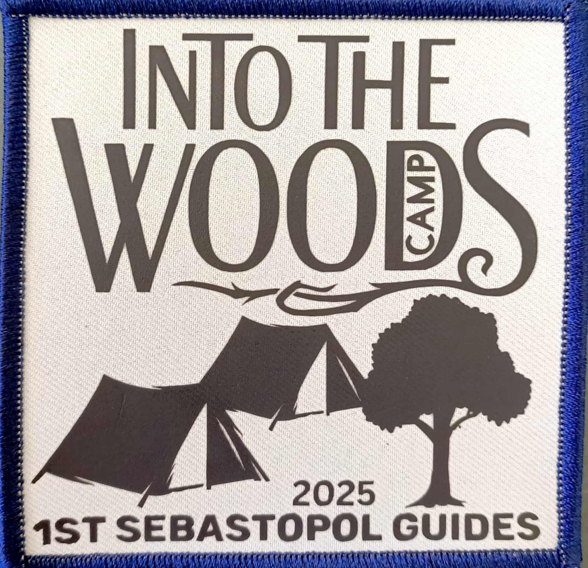 Woven sew-on badge with a pale blue background and a dark blue edge. 9cm square.