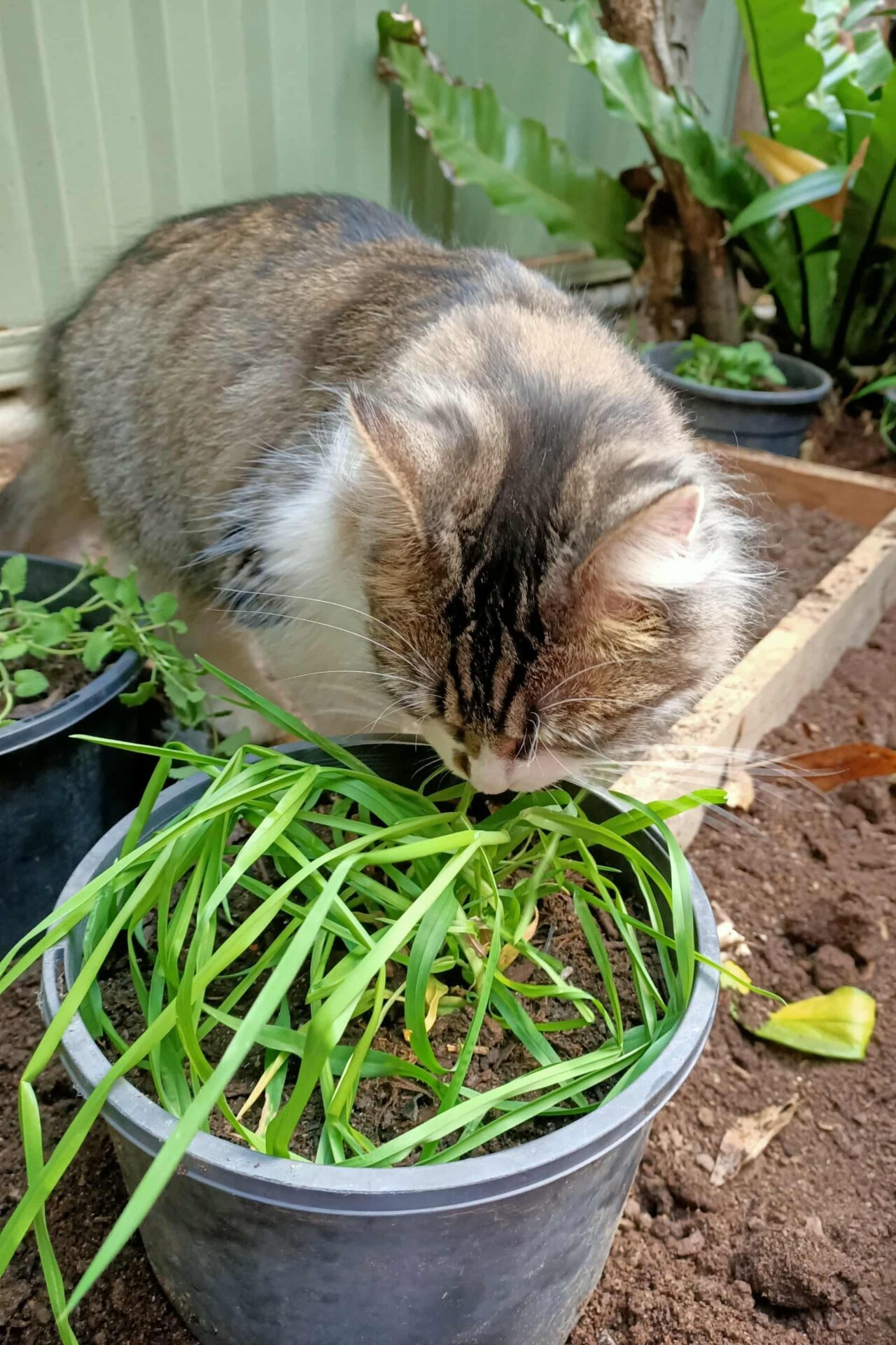 The youngest cat, Mabel, was very curious from the start and supervised the whole process. She sat on the marigolds, chewed on the cat grass, walked through the cat mint, and balanced on the wooden frame – but wouldn’t touch the soil within. Just as I was getting a little concerned that the Poo Patch was destined to be a waste of time, it was actually used for it’s intended purpose.
