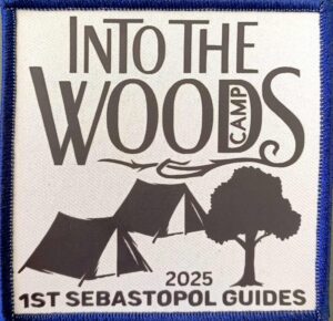 The badge is pale blue with a dark blue woven edge. 9cm square.