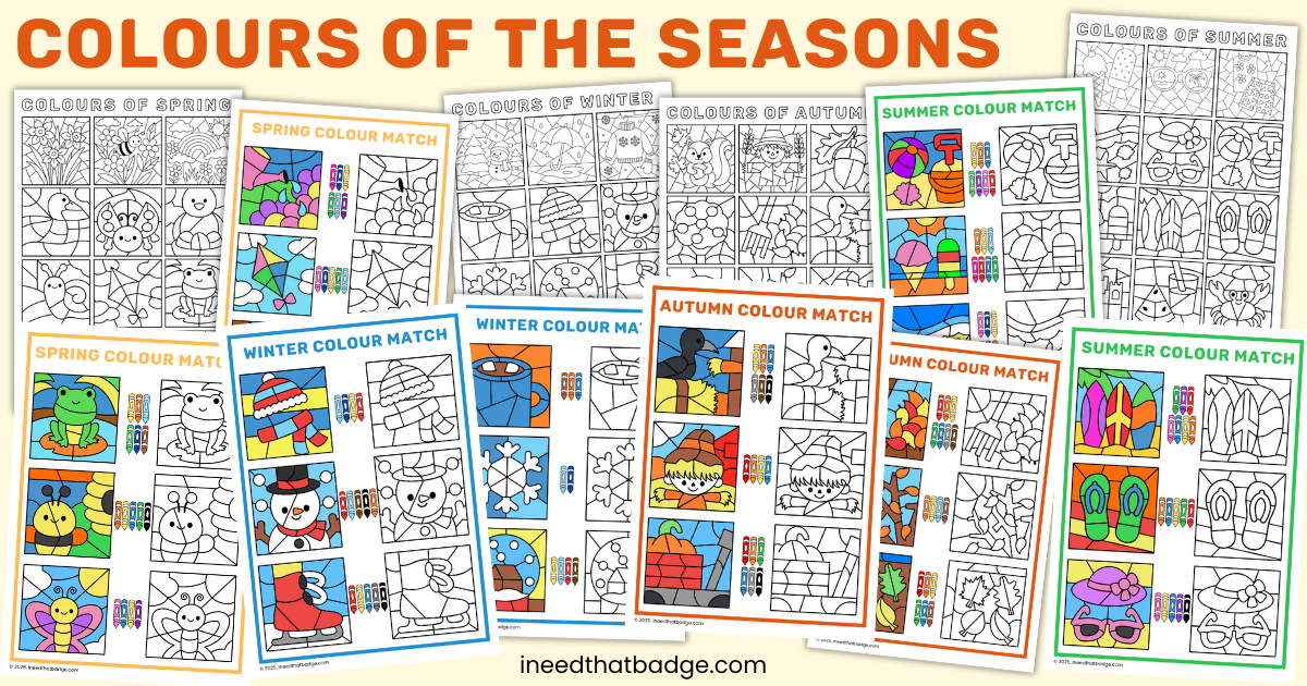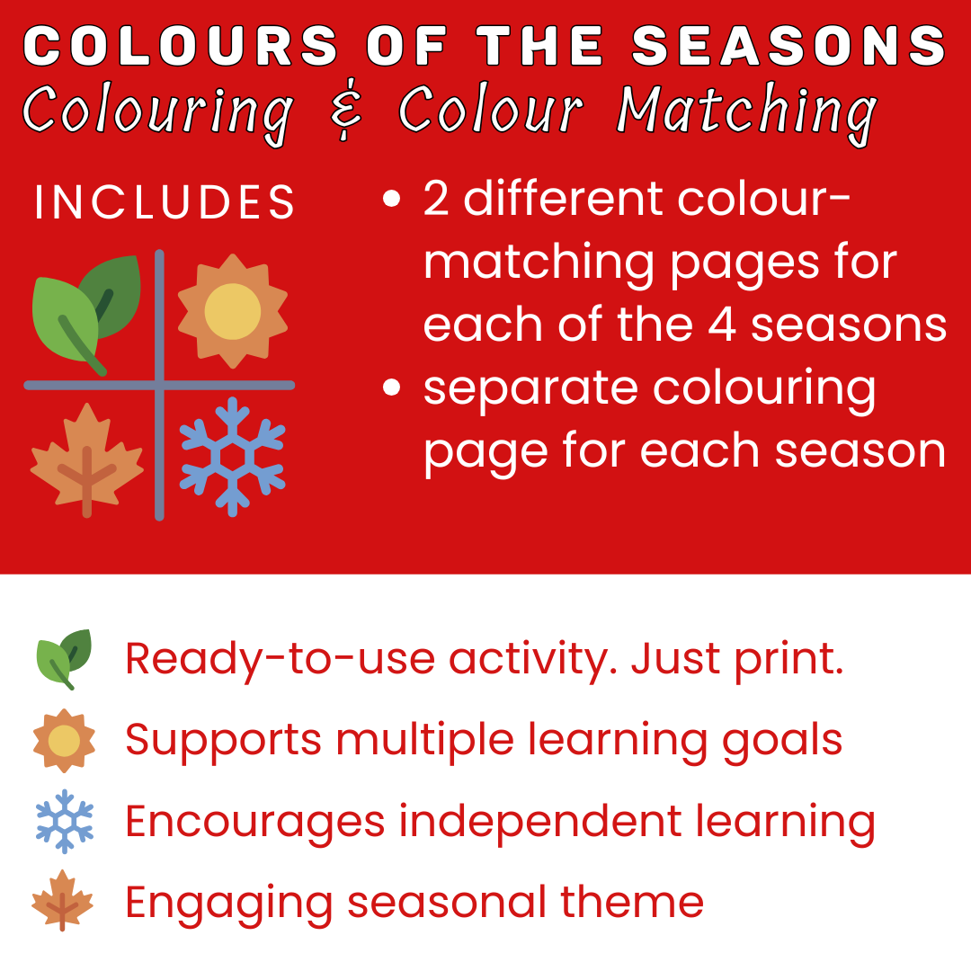 Colouring & Colour Matching Activity for summer, spring, winter and autumn.