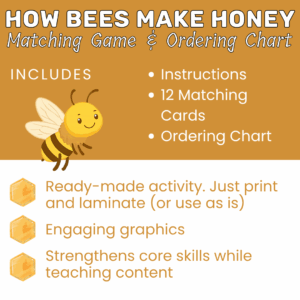 A set of cards for matching or memory games focused on the honey-making process. Play by matching text to images, or print duplicate sets for a memory-style challenge. Ideal for pairs or small groups.