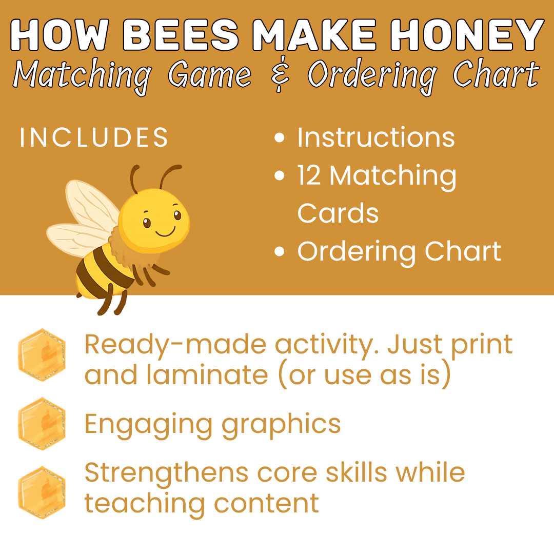A set of cards for matching or memory games focused on the honey-making process. Play by matching text to images, or print duplicate sets for a memory-style challenge. Ideal for pairs or small groups.