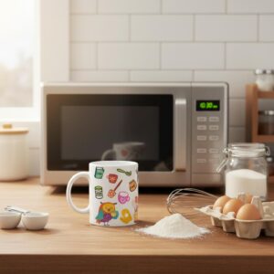 If you’re taking on the “I Made It In a Mug badge” challenge, make it extra special by making your recipe in a matching mug. These colourful mugs designs are perfectly themed to match the badge, featuring cute kitchen illustrations, a variety of mugs, and the colourful little owl from the badge.
