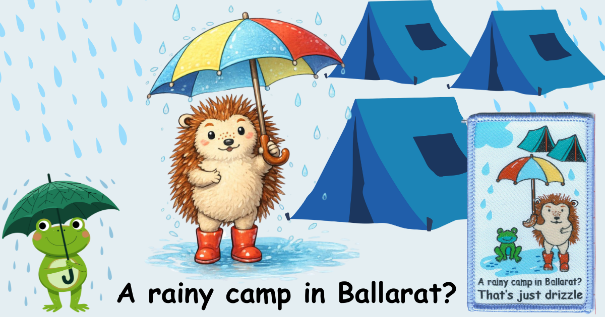 This gorgeous badge was created to coincide with the Girl Guide jamboree held in Ballarat in 2023. It was held at the exact same venue as the Scout jamboree that turned out to be the wettest January on record.