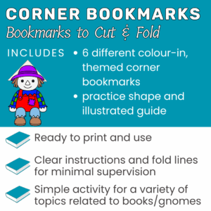 Easy to make – colour in the pictures, cut along the outline and follow the simple folding instructions to create a corner bookmark that slides neatly over the top outer edge of a book page.